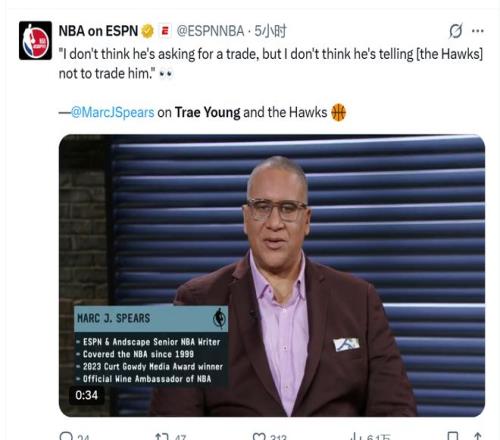 原文如下:据ESPN消息人士透露,亚特兰大老鹰队全明星球员特雷·杨及其经纪人阿隆·明茨、德鲁·莫里森和奥斯汀·布朗正在与球队商讨交易事宜。杨的经纪人和老鹰队已于上周开始进行合作谈判,力求找到解决方案。