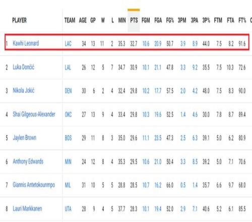 在快船打出12胜2负期间,小卡打了13场比赛,战绩11胜2负。小卡在这段时间里场均得到32.7分6.9篮板3.8助攻2.6抢断1.0盖帽,这完全是攻防一体的表现。值得一提的是,小卡的场均得分力压这段时间场均得到30.9分的东契奇排名第一。